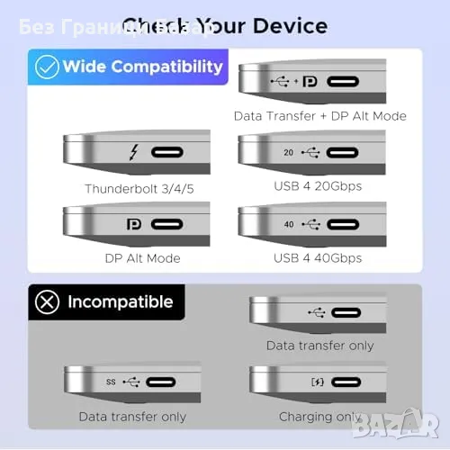 Съвместим с Thunderbolt 3/4/5 – работи с MacBook, iPad Pro, Surface, Galaxy Tab, iPhone, Pixel и други.