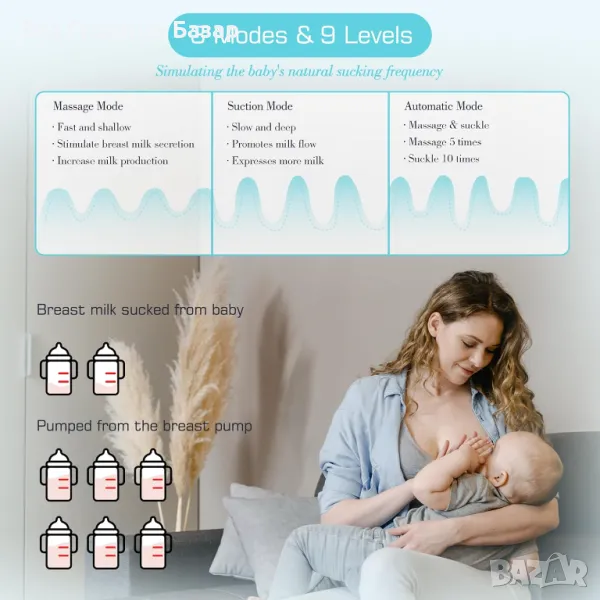 3 режима, 9 нива – масаж, изцеждане, смесен режим; подобрява комфорта и ефективността