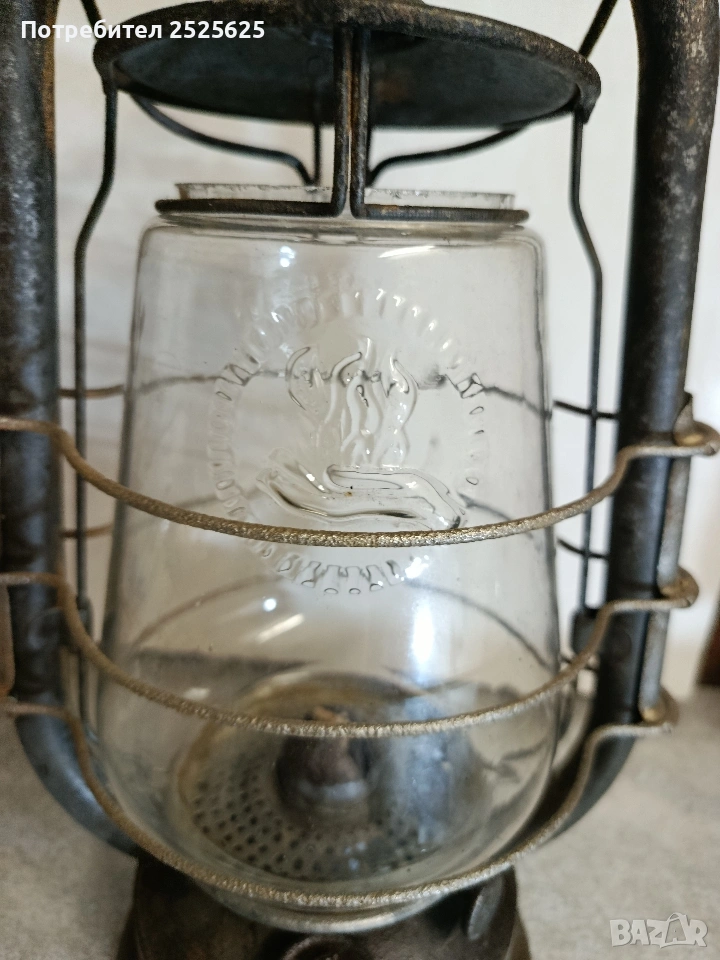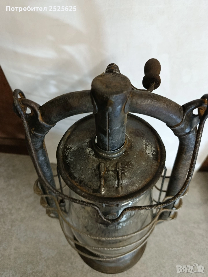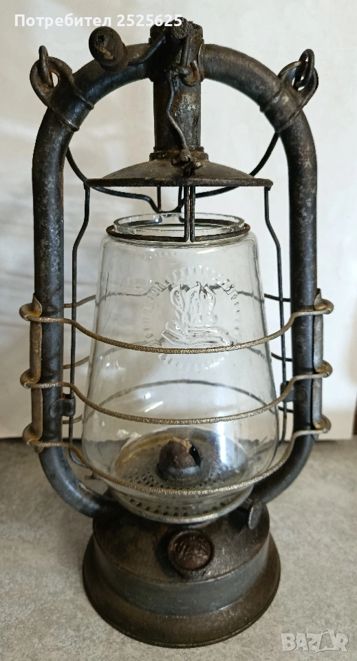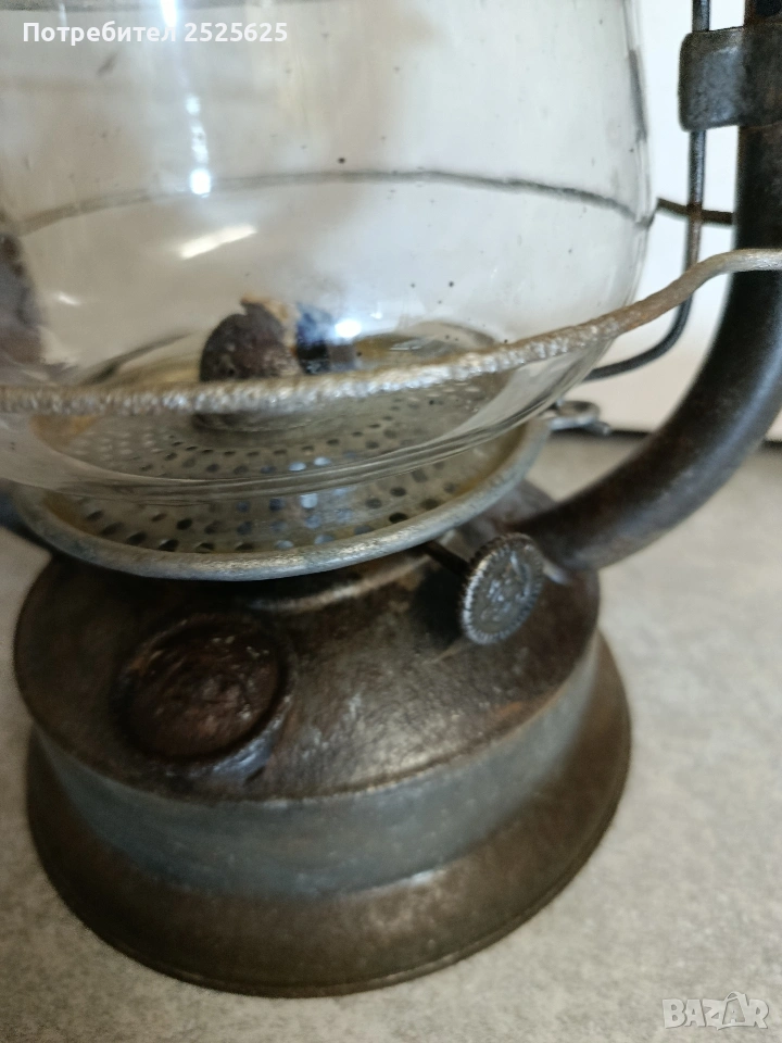Работещ, изцяло почистени оригинални части. Стъклото е фирмено, дебело стенно, лято, с работещ фитилен механизъм. Изработена е нова дръжка на манивела/дърво. Висок 330 мм. заПредполагаем период на производство - 20-те години на миналия век