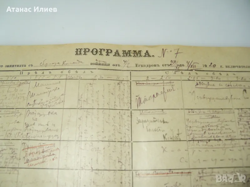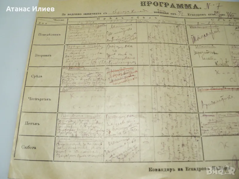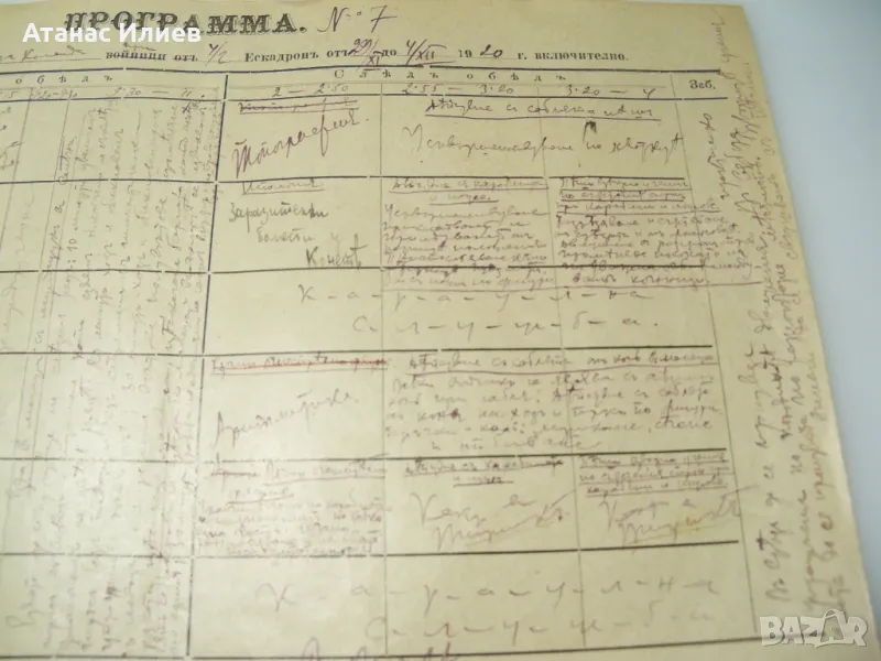 Военна програма от 1920г. за водене на занятия на кавалерийски ескадрон. Програмата е разделена по дни и часове, сутрин и следобед от понеделник до събота. Изключително интересна находка.