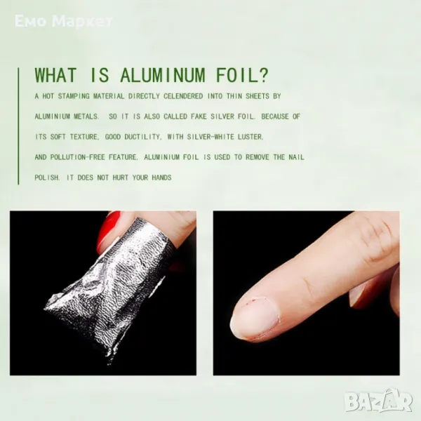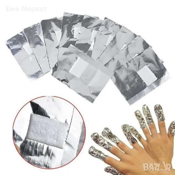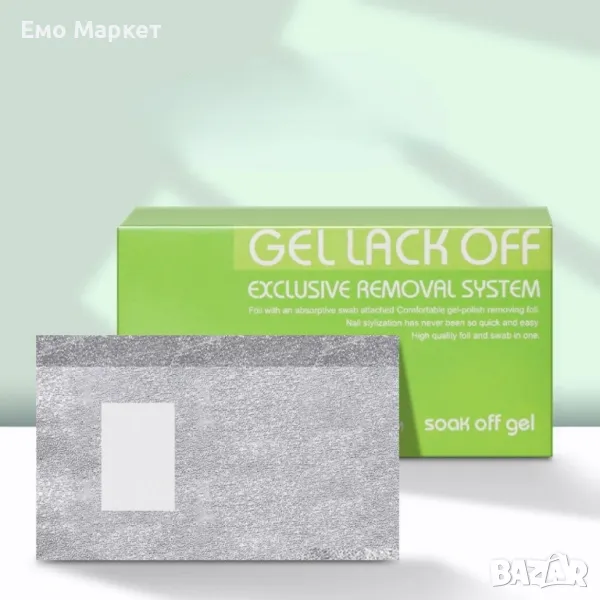 Фолиото за премахване на гел лак е представено в опаковка с 100 броя, като всяко фолио е с размери 10,5 х 8,5 см.
