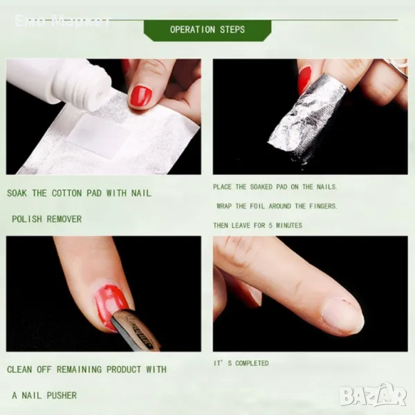 Този продукт е идеален за лесно и ефективно премахване на гел лак от ноктите, като осигурява удобство и бързина в процеса.