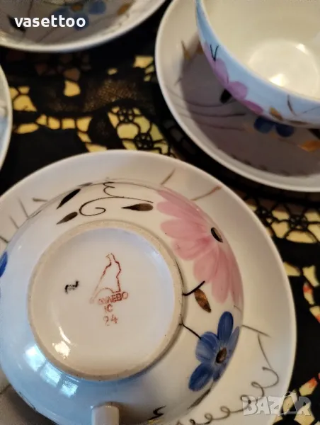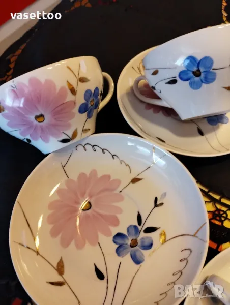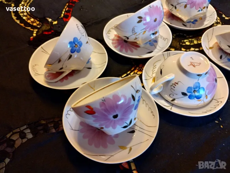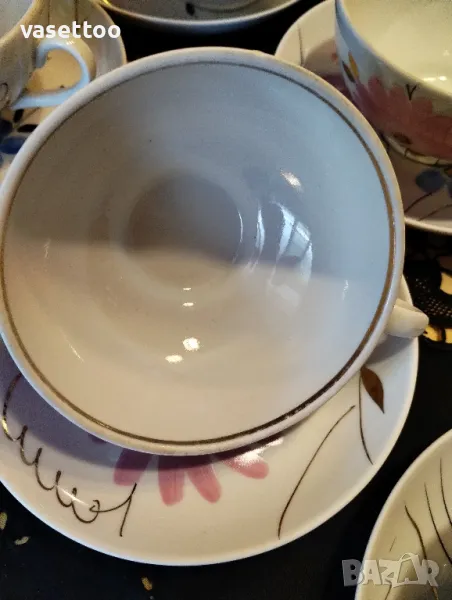 Комплектът включва шест чаши 6/10 см. с вместимост около 220 мл. и шест подложни чиниики 14 см. На две от чашите има леко протриване на вътрешния златен кант, което съобразено в цената. Моля, разгледайте и другите ми обяви, има много красиви неща!