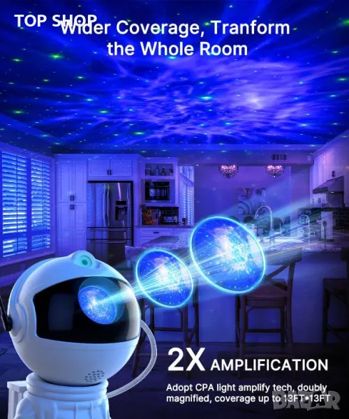Изживейте вселената с космически проектор, включващ магнитна, въртяща се глава на астронавт с регулируеми рамена за персонализирани проекции на мъглявини. Той предлага 7 завладяващи ефекта на мъглявина с мигащи зелени звезди, управлявани от удобно дистанционно за регулиране на цветове, скорости и яркост. Идеален като нощна лампа или за подобряване на атмосферата във всяко пространство, той е идеалният подарък за специални поводи, пренасяйки красотата на галактиката във вашия дом. Забележка: Дистанционното изисква 2 AAA батерии, които не са включени. Проекторът работи чрез USB кабел.