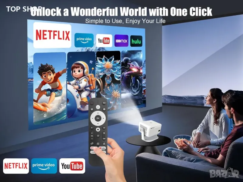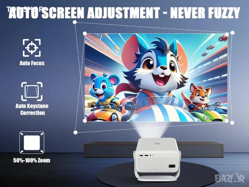 проектор поддържа 700+ официални телевизионни приложения, включително сертифицирани Netflix, без да е необходим допълнителен телевизионен стик. Той разполага с естествена разделителна способност 1080P, яркост 400 ANSI и усъвършенстван чип Amlogic T950D4 за остри визуализации и живи цветове във всяка настройка. Автофокусът, 6D трапецовидната корекция и въртящата се на 180° стойка осигуряват бързи настройки и гъвкаво разположение. 2.4G/5G двулентов WiFi с нулево забавяне позволява плавни връзки за игри и стрийминг. Вградените hi-fi стерео високоговорители, Bluetooth 5.2 и безжичното отразяване на екрана подобряват аудио-визуалното изживяване за безпроблемно забавление.