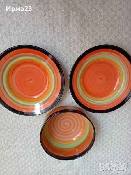 Комплект керамични купички състоящ се от 6 малки купи с размер 6см височина и 10см диаметър. Три по- големи купи 6см височина и 12см диаметър. Размер на най голяма купичка 7см височина и диаметър 14см. Чинии диаметър 18см и височина 4см.