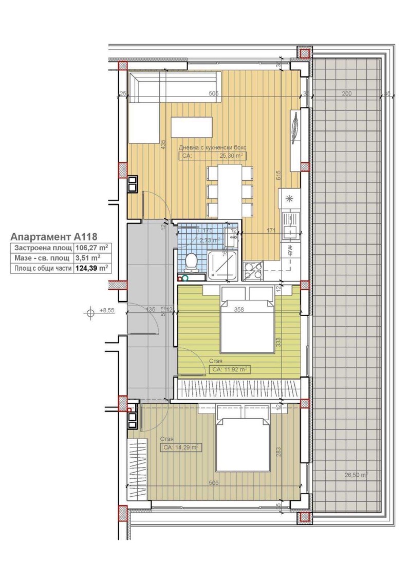 Тристаен апартамент с голяма покривна тераса А118 изложение: изток - север - запад, на отлична локация над кв.павлово в м.Гърдова глава (част от кв.Бояна) на ул.'Преки път' 84 в луксозна жилищна сграда с изцяло окачена вентилируема фасада и дограма от композитен материал GENEO на REHAU с троен стъклопакет, четворна хидроизолация на покрив и покривни тераси. Етап: Довършителни работи; Крайната цена е с включен ДДС.
