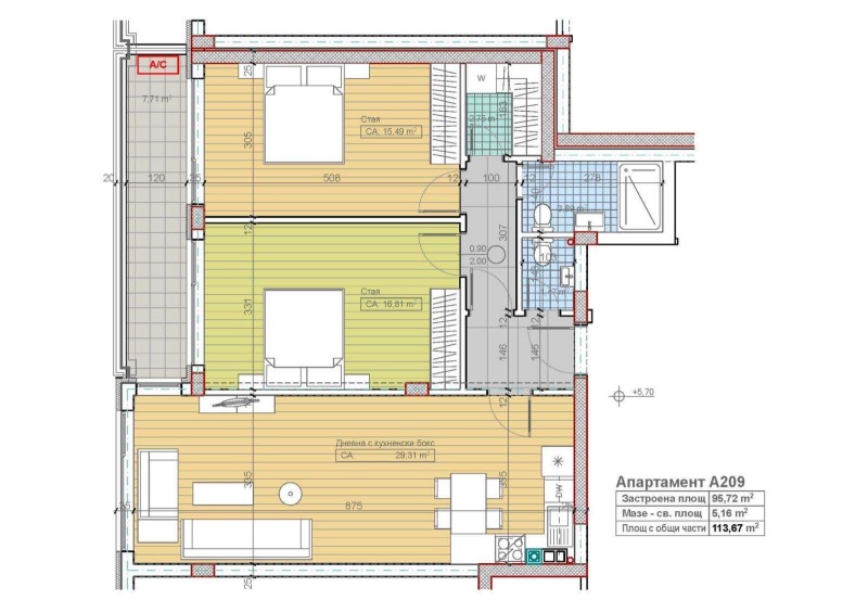 Голям Тристаен апартамент А209 изложение: юг за всички стаи с изглед към витоша ;дневна - 30 кв.м и 2 стаи 15 и 17 кв.м на отлична локация над кв. Павлово в м.Гърдова глава (част от кв.Бояна) на ул.'Преки път' 84 в луксозна жилищна сграда с изцяло окачена вентилируема фасада и дограма от композитен материал GENEO на REHAU с троен стъклопакет, четворна хидроизолация на покрив и покривни тераси. Етап: довършителни работи ; Крайната цена е с включен ДДС.
