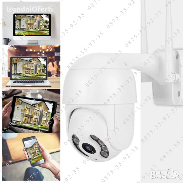 Чисто нови въртящи се на 355 градуса по хоризонтала и 110 градуса по вертикала (PTZ) безжични WIFI IP Full HD 1080p 8.0MP камери с резолюция 1920х1080 FULLHD, 3.6mm фокус. Камерите са прахо и влагоустойчиви, покриват стандарт IP66 могат да бъдат поставени на открито.
