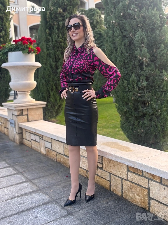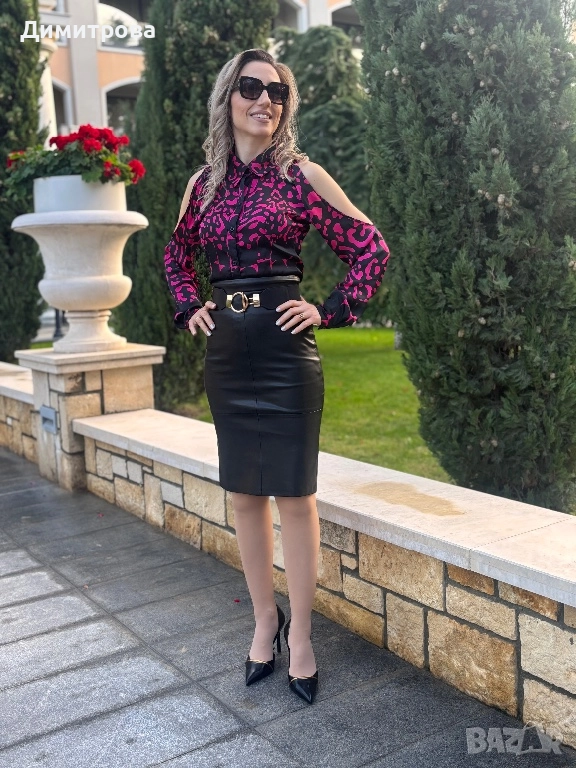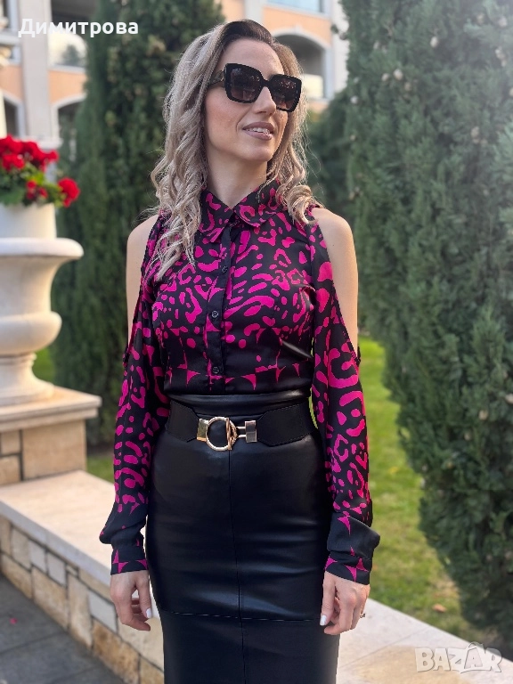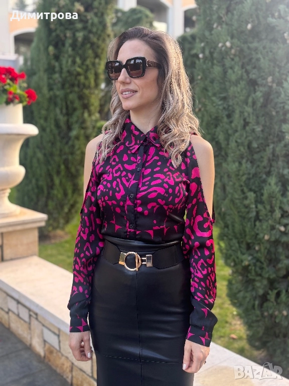 Дамска сатенена риза с интересен животински принт и отворени рамене в черно и розово. Ризата е нова. Предлага се в размери: XS, S, M, L, XL