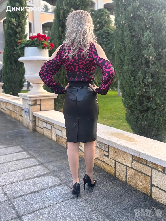 Дамска черно с розово сатенена риза с животински принт голи рамене XS-XL → Обява 49522033