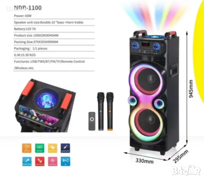 караоке тонколона разполага с два мощни 12-инчови високоговорителя и високочестотен високоговорител, които осигуряват кристално чист и дълбок звук. Благодарение на безжичната връзка чрез Bluetooth 5.0, USB и TF входове, тя предлага разнообразие от възможности за възпроизвеждане на музика, докато вграденият FM тунер и True Wireless Stereo (TWS) ви позволяват да свържете две тонколони за още по-впечатляващо аудио изживяване.