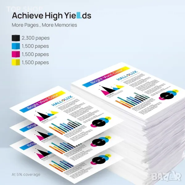 Касетите с мастило HALLOLUX 950 950XL 951XL са перфектни заместители на HP 950 951 XL, предлагащи ясен текст и ефекти на живо изображение. Съвместими с HP Officejet Pro модели 8100, 8600, 8610, 8615, 8620, 8625, 8630, 8640, 276dw и 251dw, тези касети могат да се похвалят с висок капацитет от 2300 страници на черна и 1500 страници на цветна касета при 5% покритие на A4 . Опаковката от 5 включва 2 черни, 1 циан, 1 магента и 1 жълта касета (опаковката може да варира). HALLOLUX осигурява красиви печатни ефекти и висококачествен, плавен печат с висока разделителна способност, идеален за ежедневна употреба.