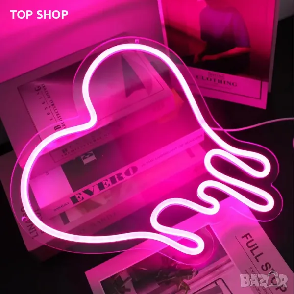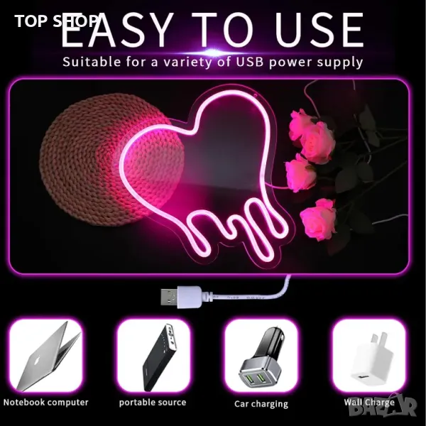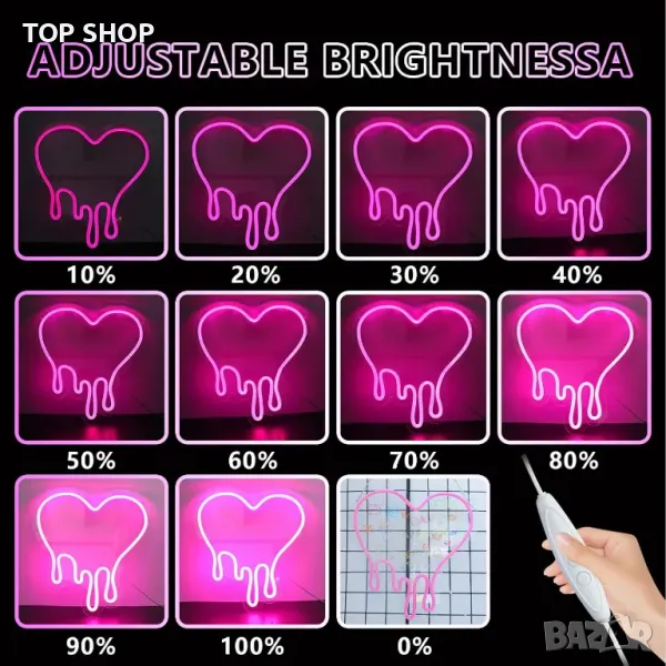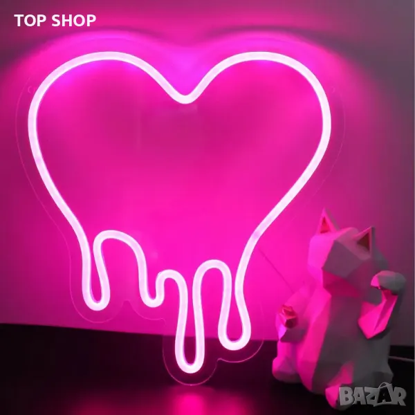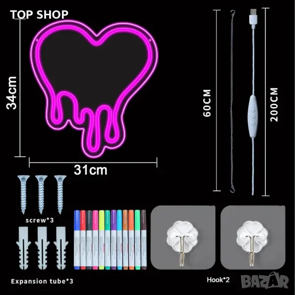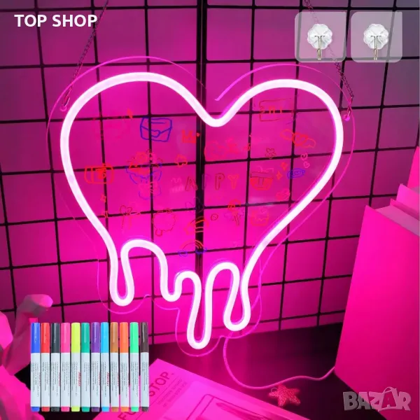 Неонов знак със сърце, розов LED знак със сърце, USB, димируем, с 12 цветни маркера