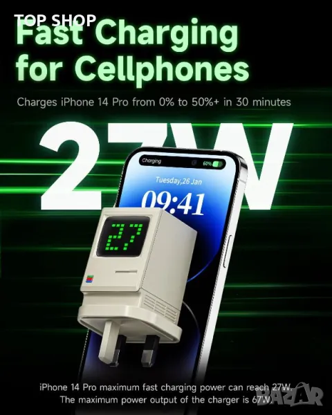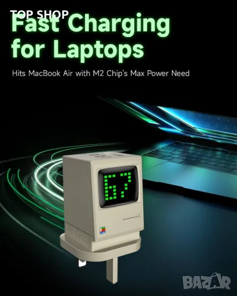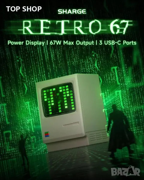 Зарядното устройство Retro 67 USB C съчетава ретро с модерно, включващо екран на дисплея за захранване и Matrix Digital Rain за показване на състоянието на зареждане и мощност в реално време. Зарядното устройство осигурява непрекъснато зареждане със своите уникално проектирани вериги в USB C1, C2 и C3 портове, позволяващи едновременно зареждане без прекъсване, когато е включено ново устройство. С 67 W високоскоростно зареждане, захранвано от технологията All-GaN, той е съвместим с най-новите устройства, като зарежда MacBook Air (M2) за по-малко от 2 часа и iPhone 14 до 58% за 30 минути. Патентованата технология за управление на светлината регулира яркостта на динамичния матричен екран, което го прави удобен за сън. Оборудван със система за активна защита и множество функции за защита, зарядното устройство Retro 67 GaN непрекъснато следи температурата на продукта за безопасно зареждане.
