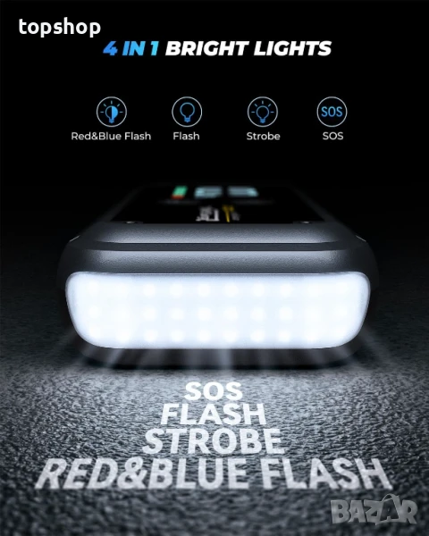 LED светлина в 4 режима: Зарядното устройство за автомобилен акумулатор е оборудвано с вградено LED фенерче, което е полезно при условия на слаба светлина или спешни случаи. То предлага 4 регулируеми режима на светлина: нормален, стробоскоп, SOS и цветен. Освен това, стартерът осигурява отлична защита за употреба в среди, вариращи от -4°F до 140°F.