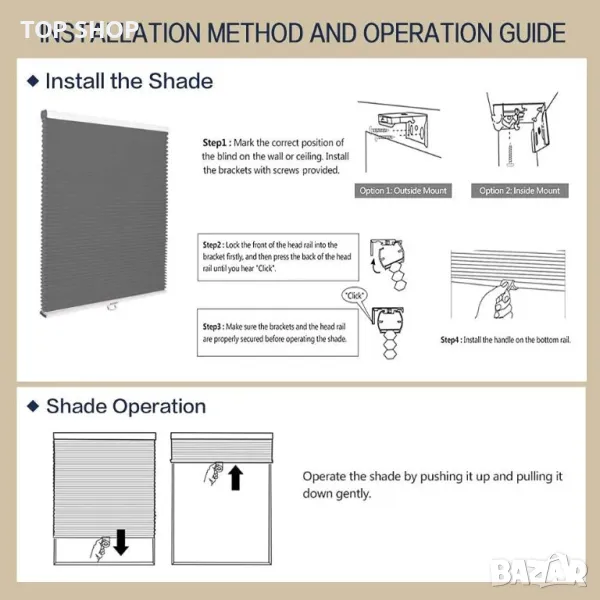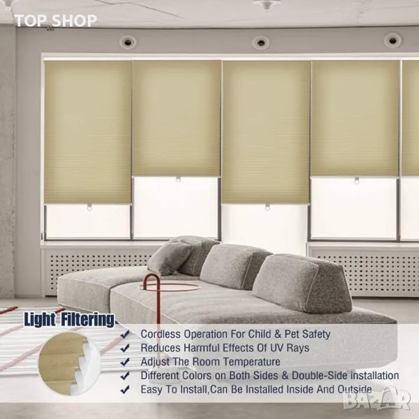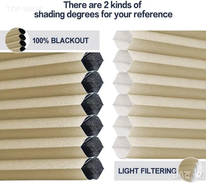 Представяме ви нашите затъмняващи щори тип пчелна пита, проектирани да блокират 100% от светлината за максимална тъмнина и уединение. За по-меко докосване на светлината опитайте нашите филтриращи светлината абажури, които запазват уединението, като същевременно позволяват малко светлина във вашето пространство. Безопасността е наш приоритет, поради което нашият безжичен дизайн осигурява сигурна среда за семейства и домашни любимци. Нашите клетъчни щори с форма на пчелна пита предлагат не само отлична звукоизолация, но и превъзходна топлоизолация в сравнение с други ролетни щори. Освен това предлагаме опции за индивидуално оразмеряване, за да пасне перфектно на вашите прозорци. Монтажният хардуер и инструкциите за монтаж са включени за лесна настройка.