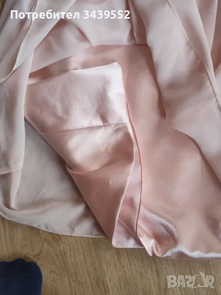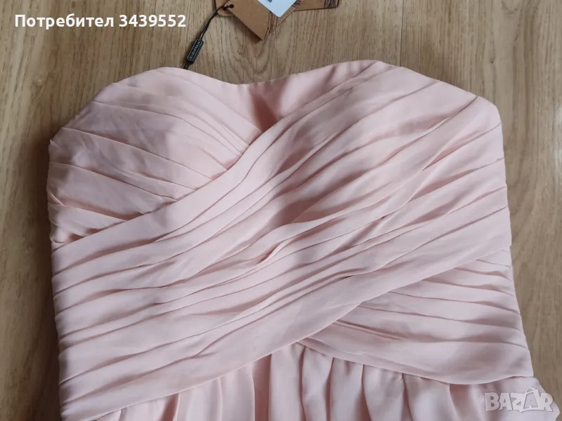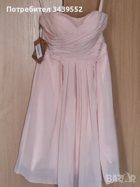 Нова, не обличана, с етикет дамска рокля в бледо розов цвят. Размер М. Изработена от шифон и сатенирана подплата. Горната част е с вградени подплънки и банели тип " корсет". Има и еластична закопчалка на гърба като сутиен. С цип на гърба.Няма възможност за презрамки. Обиколка под бюста- 83 см. Дължина от под бюста- 65см.
