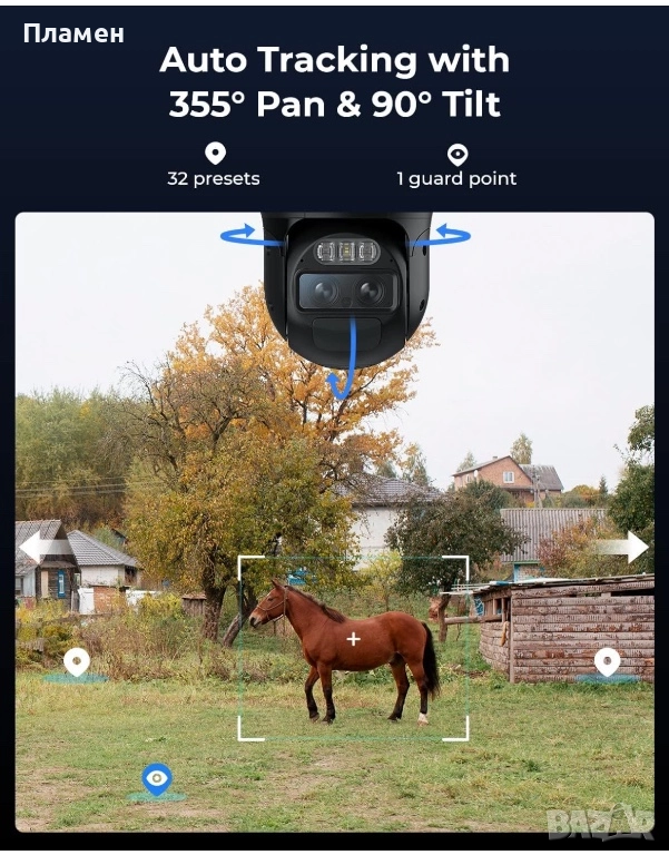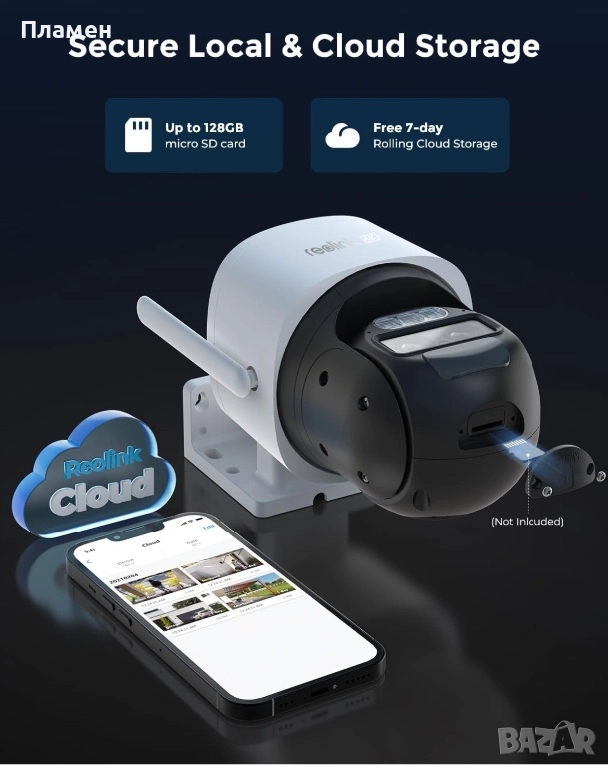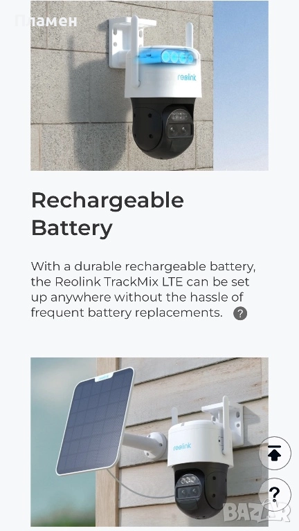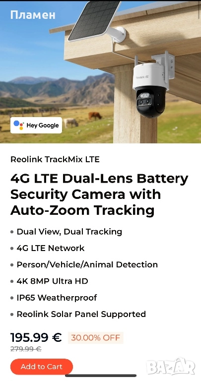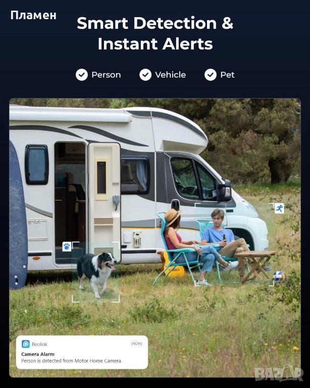 Системата работи изцяло автономно – със SIM карта за 4G връзка и включен соларен панел, който зарежда батерията, без нужда от ток. С вградено интелигентно разпознаване на животни, хора и превозни средства, камерата изпраща известия директно до телефона ти чрез приложението Reolink, което позволява наблюдениие в реално време, без значение къде се намираш.