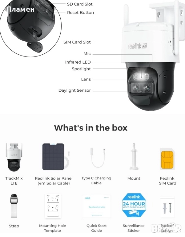 С Reolink TrackMix LTE-C се наслаждавате на безпроблемнo наблюдаwane в реално време, навсякъде. Тази напълно безжична ултра-HD камера предлага висококачествено видео и аудио излъчване, дори в отдалечени и труднодостъпни места, без нужда от Wi-Fi мрежа (Необходима е 4G връзка с мобилен оператор и SIM карта).