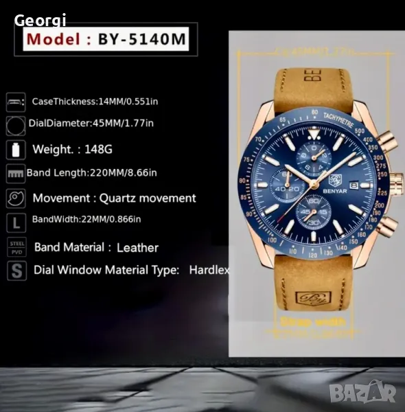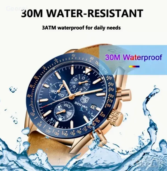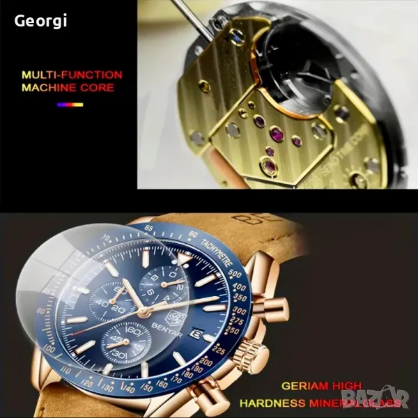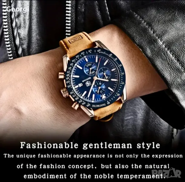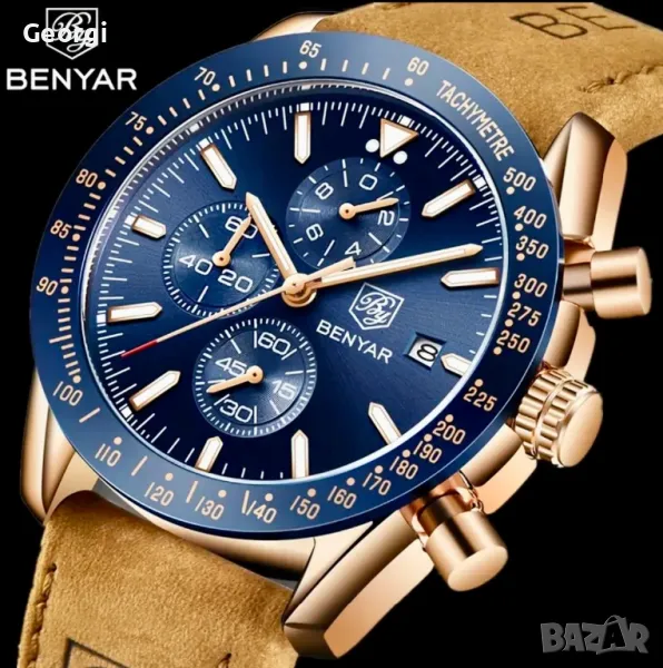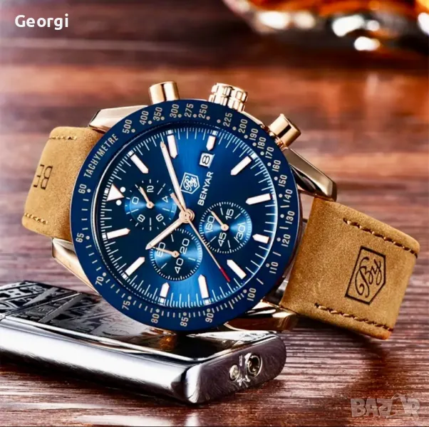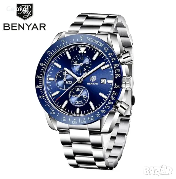 Класически, Забележим и Луксозен мъжки кварцов хронограф *By Benyar Blue7* - сребристо/синя плочка сливаща се с кайшката!