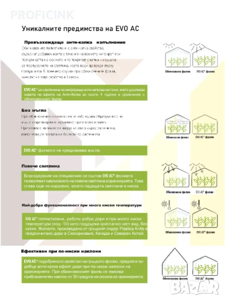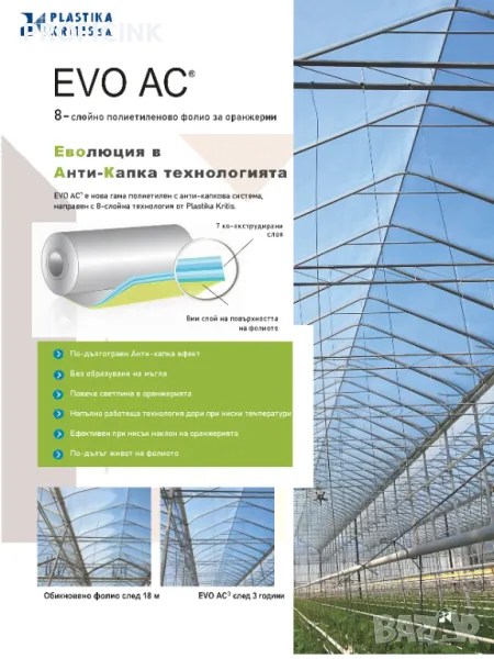 4. Без мъгла - при обикновеният полиетилен се наблюдава образуването на мъгла в оранжериите, предимно при изгрев и залез. При появата на мъгла се натрупва влага върху растенията, което води до появата на болести по растенията. Evo Ac фолио - не предизвиква мъгла