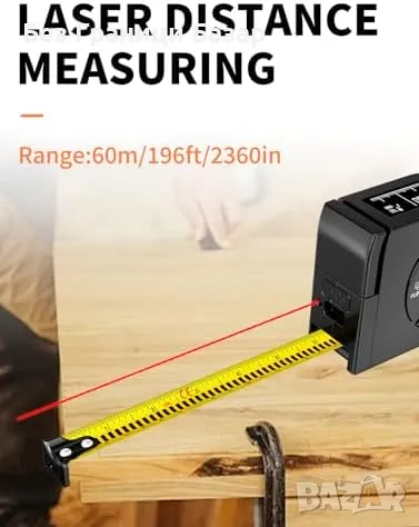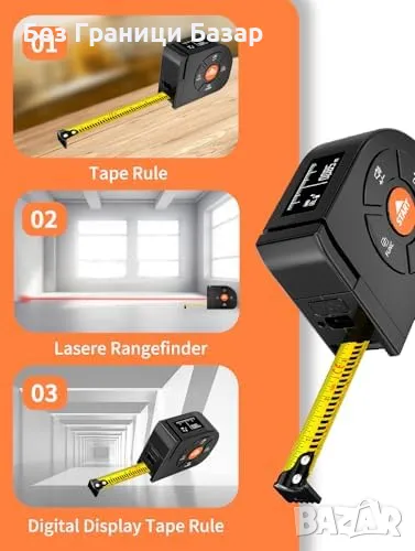 3-в-1 лазерен и рулетен метър – 5m стандартна рулетка + 60m лазерно измерване