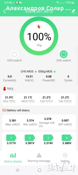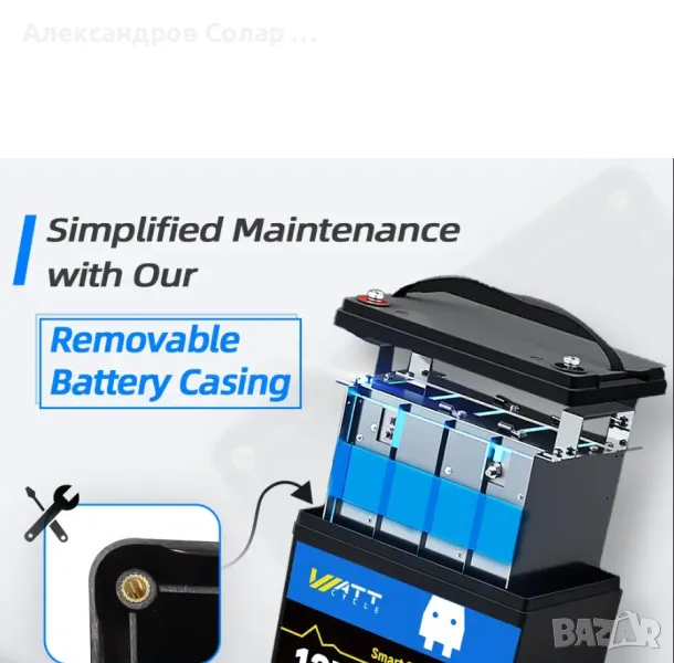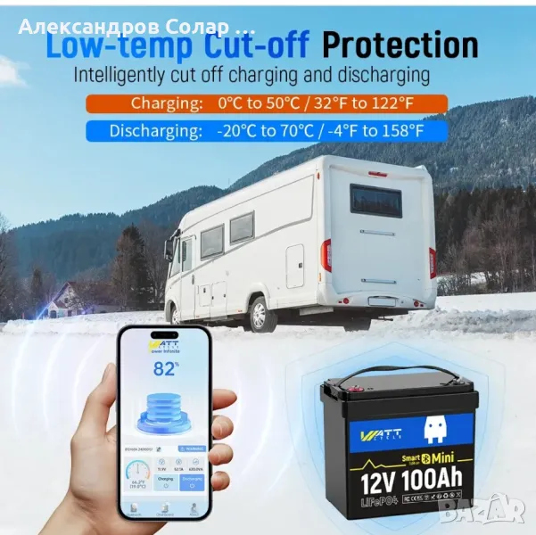 Литий-желязофосфатен акумулатор с блутут 100 Ач . Реален капацитет. Мониторинг от ап . Показва брой цикли, напрежение и температура на всяка клетка. Защита при ниски температури.