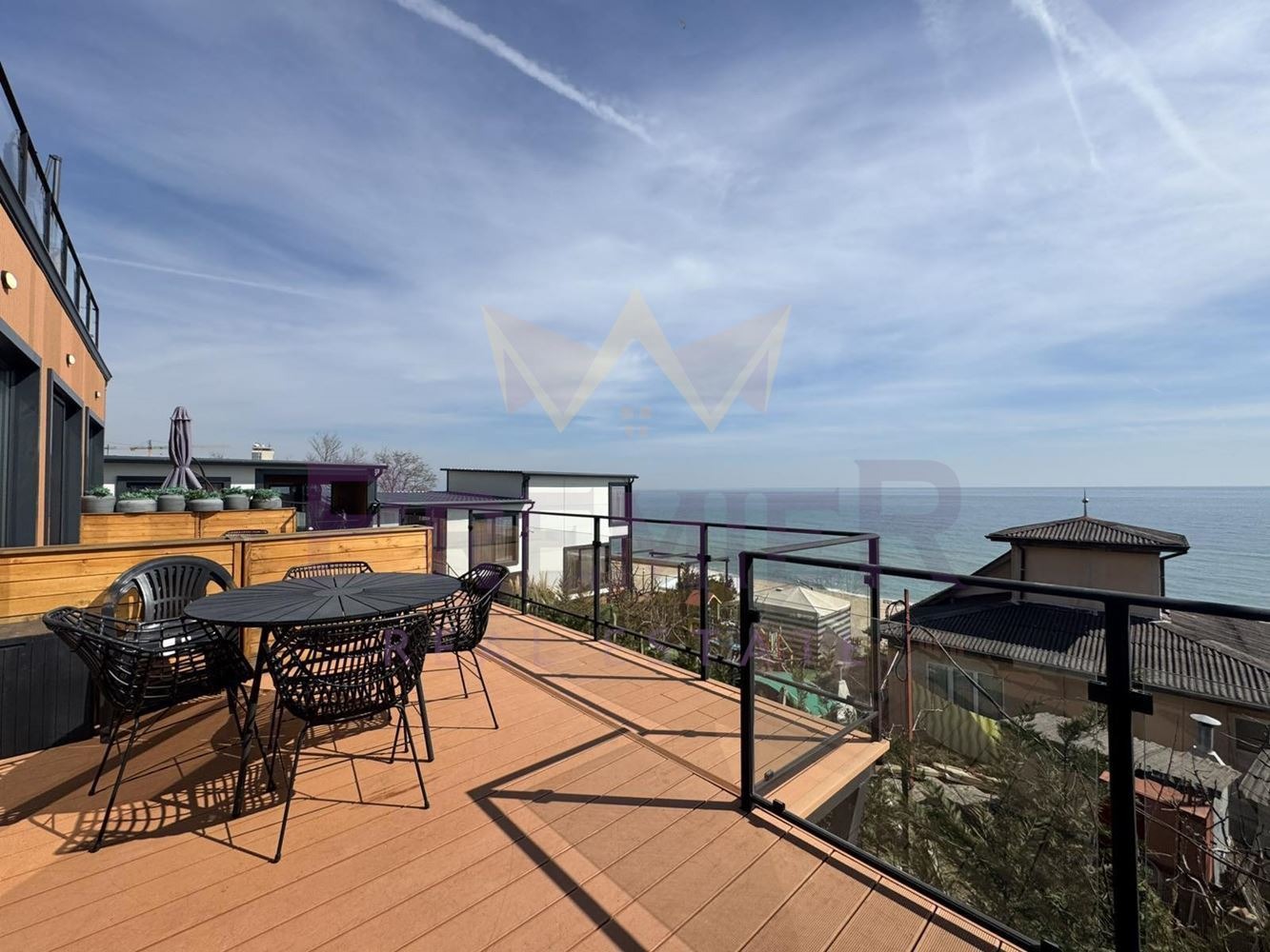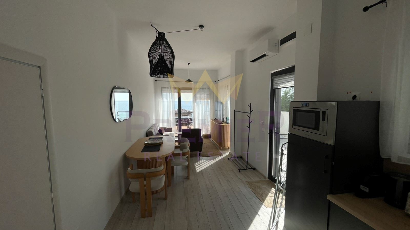 ** Апартаментът е изпълнен със светлина, благодарение на големите прозорци, които разкриват красива морска гледка.