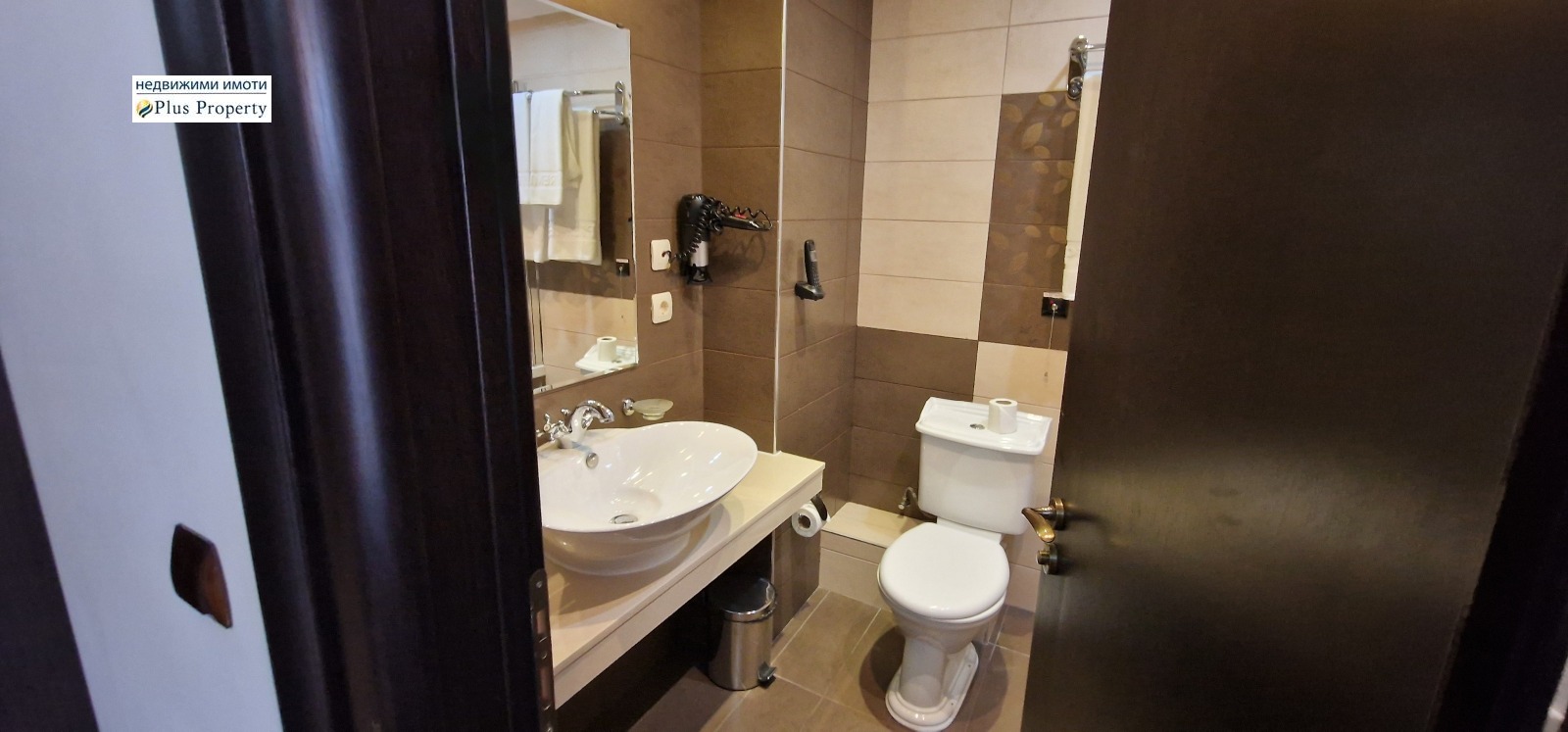 Банята е луксозно оборудвана с мивка, тоалетна и вана.