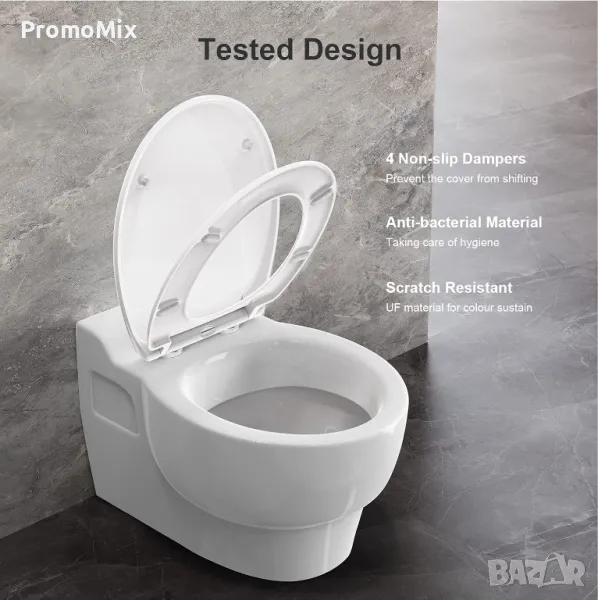 тоалетна чиния изработена от UF (урея-формалдехид), който е вид дуропластичен материал устойчив на счупване, надраскване и е антибактериален.