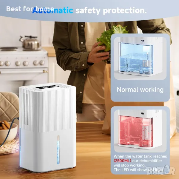Функция за защита от преливане За да гарантираме вашата безопасност, нашият влагоуловител е оборудван с множество защитни функции, включително защита от претоварване и защита от преливане. Веднага щом възникне аномалия, устройството веднага спира да свети червената светлина. Благодарение на тези защитни мерки можете да използвате влагоуловителя, без да се притеснявате за опасности