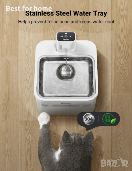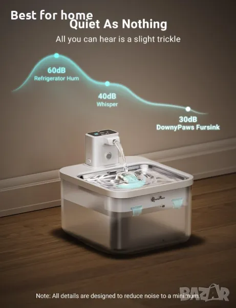 Безшумна и интелигентна водна помпа: Безжичната водна помпа за котки DownyPaws е оборудвана с безшумна водна помпа от 30 децибела, осигуряваща спокойна среда. Снабдена със защита за нивото на водата, помпата ще се изключи автоматично, когато нивото на водата е ниско. Неръждаемата стомана на фонтана за котка е защитена от повреди, което удължава живота му за надеждна и издръжлива употреба.