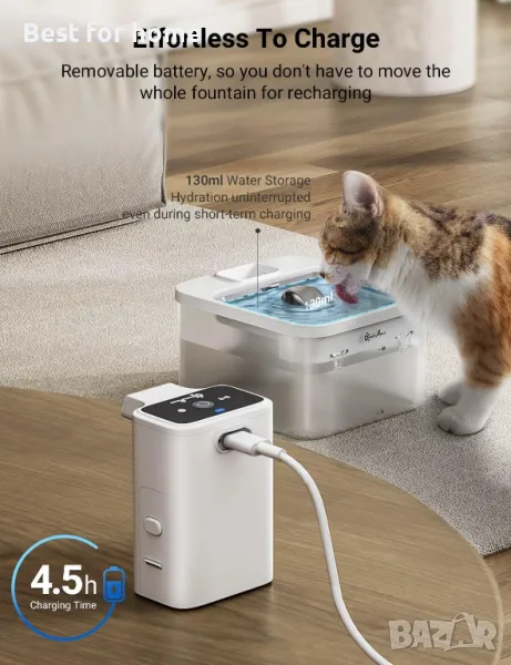 【Страхотен капацитет на батерията】 Диспенсърът за вода за котки DownyPaws е оборудван с вградена акумулаторна батерия от 40100 mAh. Позволява ви да пътувате без притеснение. Вече не е нужно да се тревожите за неочаквани прекъсвания на тока. Оборудван с чип за бързо зареждане и сменяема батерия за лесно зареждане.