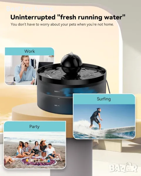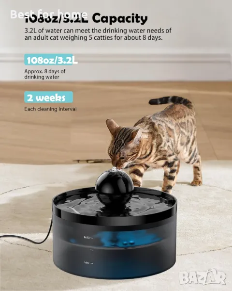 【Капацитет 3,2 л】 Котешкият фонтан има капацитет 3,2 л и отговаря на нуждите за пиене на възрастни котки за 7-9 дни. Дори ако излизате по работа или на път, фонтанът с котешка вода може да осигури достатъчно чиста питейна вода за вашия домашен любимец. Можете да пътувате с увереност!