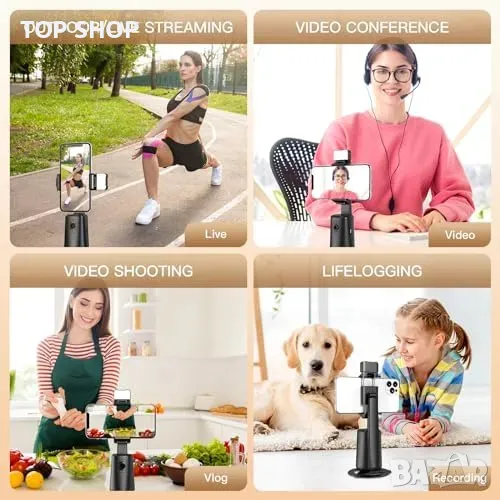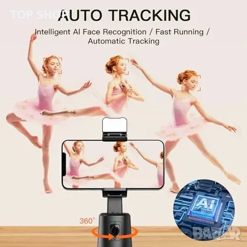 Ключови думи: Стабилизатор за телефон, AI проследяване, 360° ротация, Телефонен статив, Автоматично разпознаване на лице и тяло, Жестово управление, Дълготрайна батерия, Гъвкава съвместимост.
