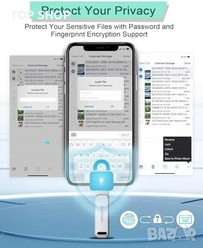 флашка, телефон, памет, 128GB, бърз трансфер, iPhone, Android, PC, USB, Type C, iOS, криптиране, сигурност, архивиране, съвместимост, нов, чужбина.