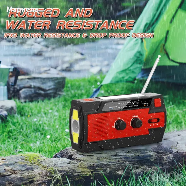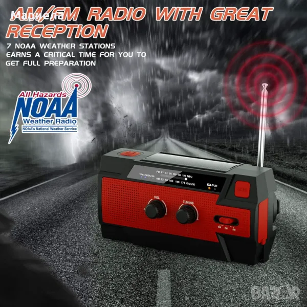 - AM/FM/NOAA аварийно метеорологично радио: това преносимо радио поддържа AM/FM/NOAA честоти. Можете не само да получавате метеорологичните условия навреме, за да избегнете лоши метеорологични условия, но и да слушате любимото си радио. (AM 520~1700KHz, FM 87~108MHz, WB 162,400~162,550MHz)