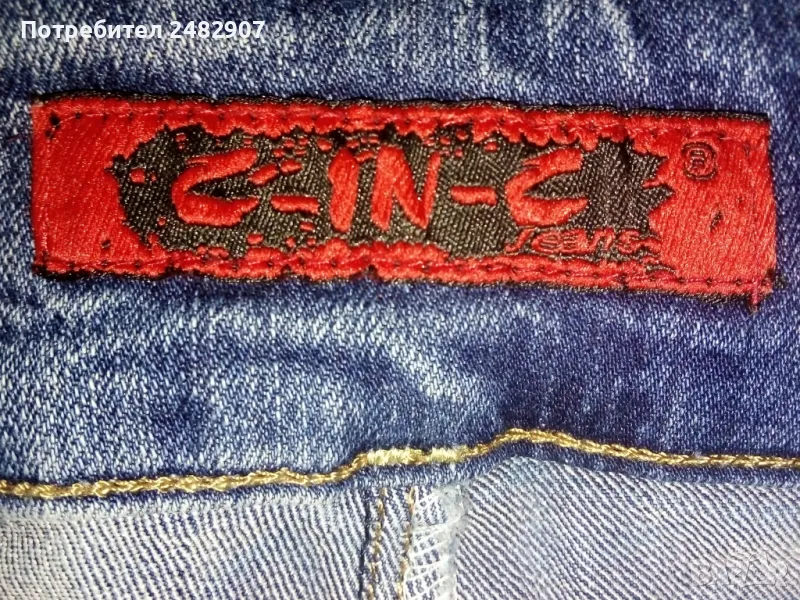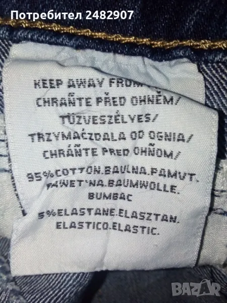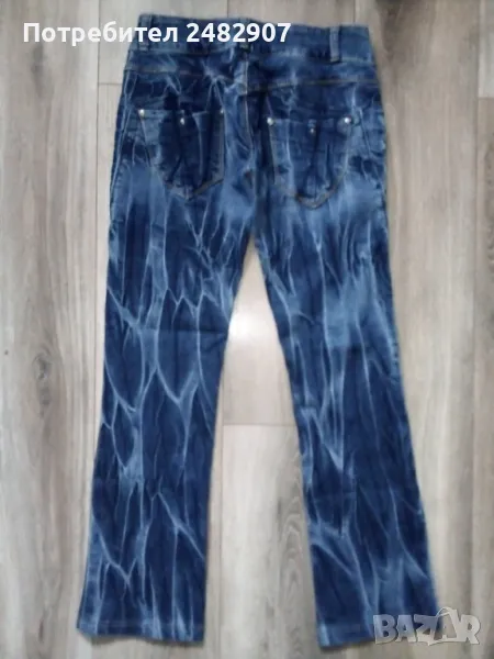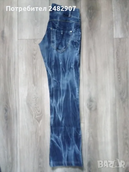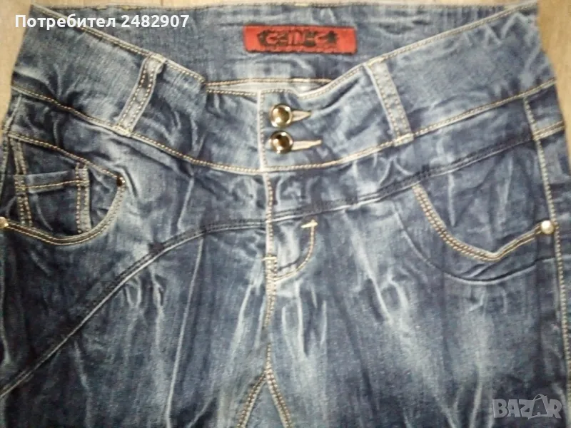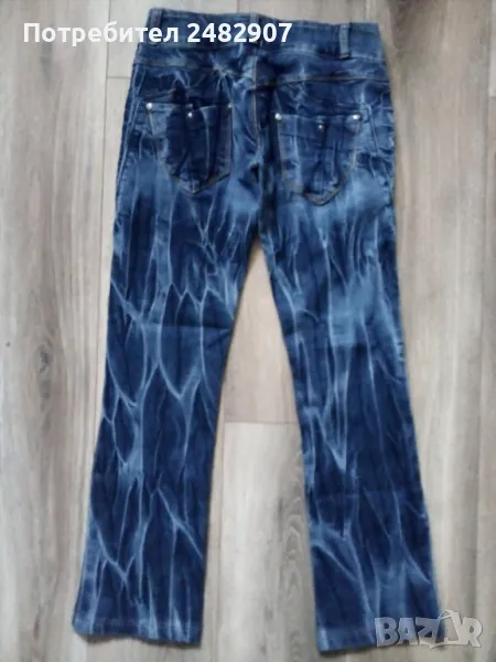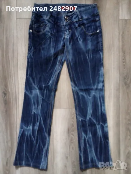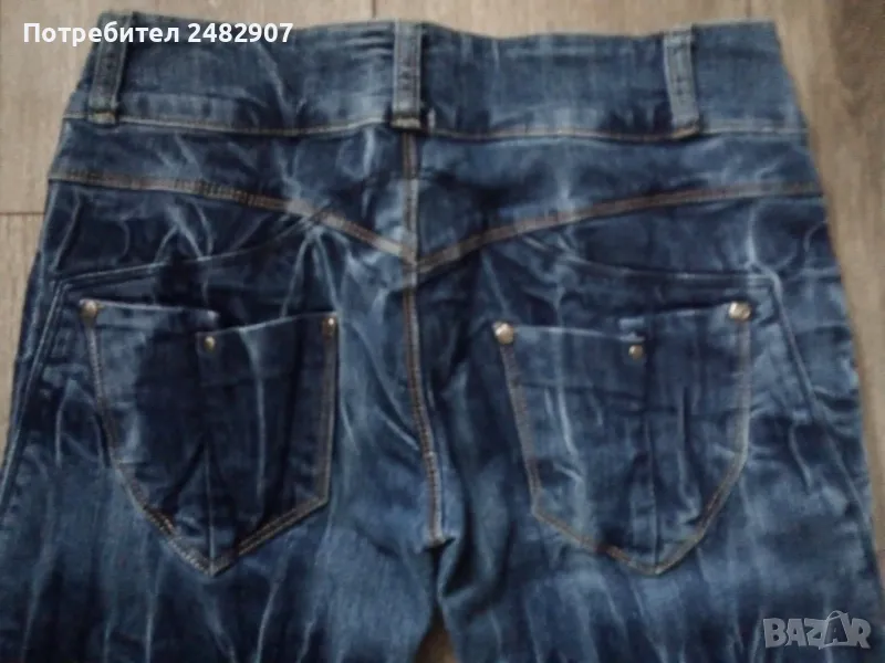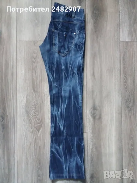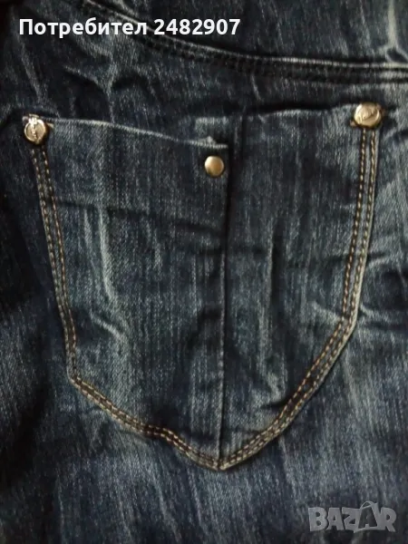 Тъмно сини дамски дънки с мачкан ефект. Съдържат 95 % памук и 5 % еластан. Ширина в талията - 37 см, дължина от талията до чатала - 18 см, дължина от талията до долу - 93 см, ширина на крачола в долната част - 19,5 см. Много запазени, почти не са използвани.