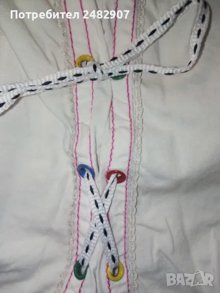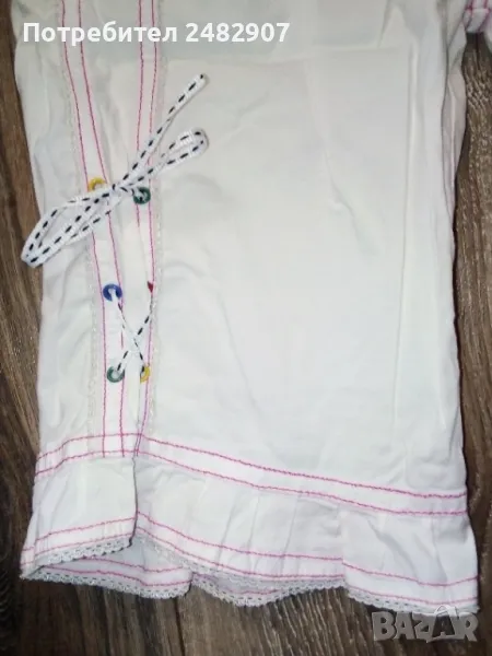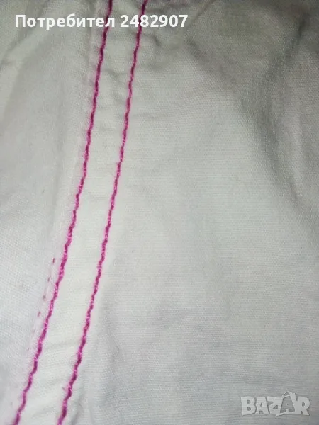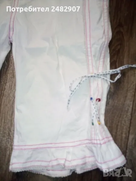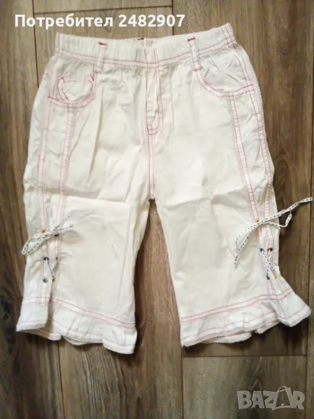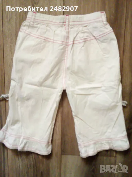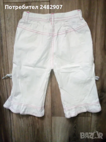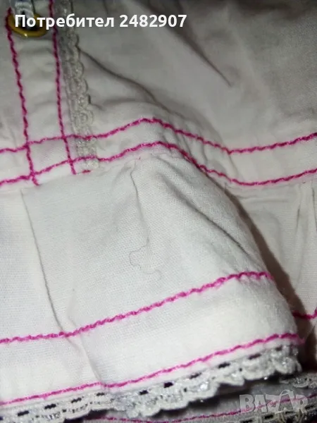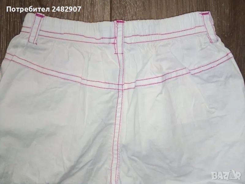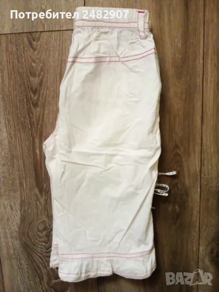 Бели детски бермуди с розови шевове за момиче. Ширина в талията - 25 см, дължина от талията до чатала - 20,5 см, дължина от талията до долу - 43 см, ширина на крачола в долната част - 23 см. Много запазени, почти не са използвани, с къдри и връзки на крачолите и ластик в талията.