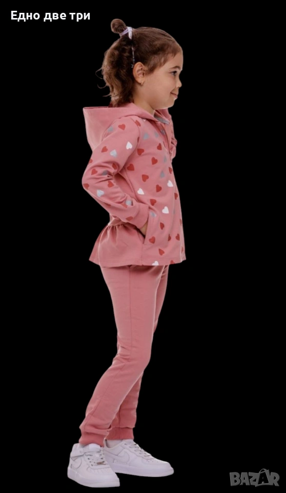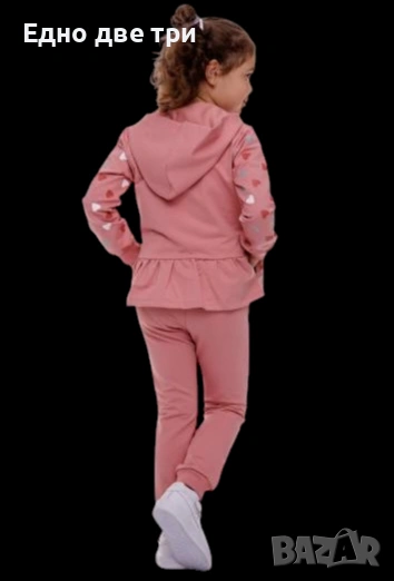 Описание:Памучни детски комплекти от две части:Горнище с дълъг ръкав с ластик на ръкавите, закопчава се с цип, с качулка и с джобчетата от двете страни. С раздвижена и модерна кройка с къдрички. Долнище с джобчета и с ластик.Удобни и практични модели, изработени от приятна и качествена памучна материя, подходящ за игри и спорт. Състав: 90% памук, 10% еластан.