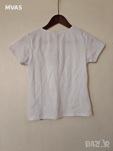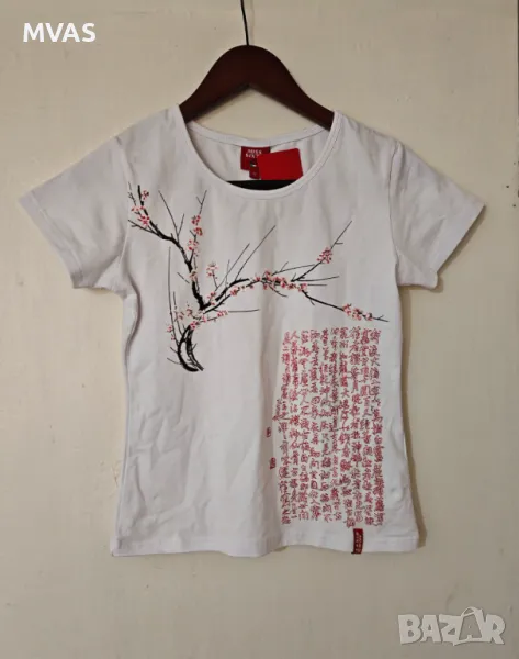 Нова дамска бяла тениска с цъвтящо дърво и червени китайски йероглифи, стилна, може и под елеци и сака да се носи