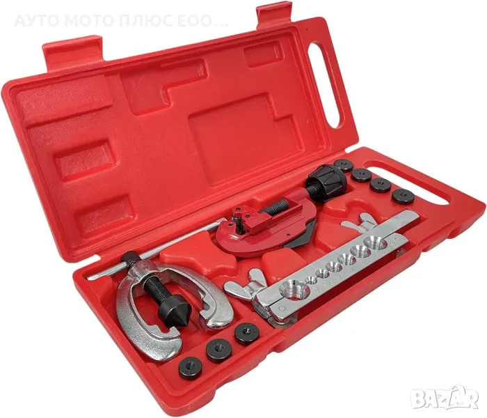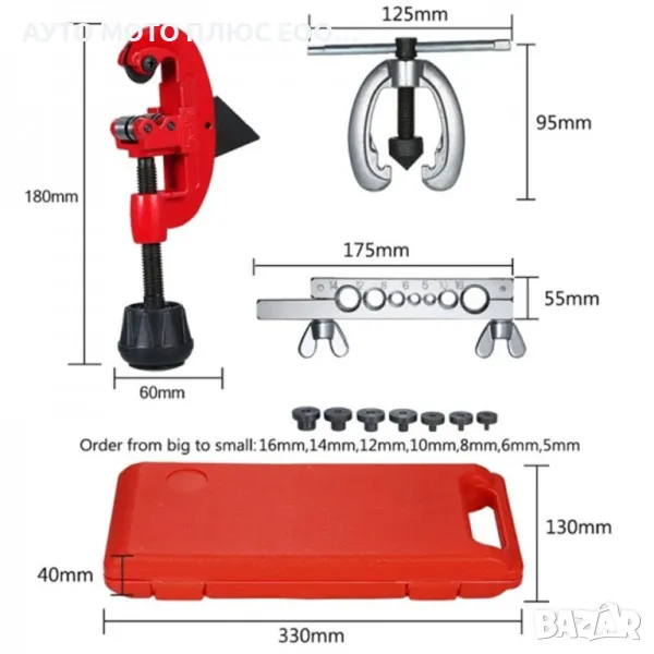 Спирачни Тръбички от 10 части е подходящ за огъване на алуминиеви и медни спирачни тръби и за изработка на конусовидни свързващи фланци. Устойчиви са на напукване и механични повреди. Комплекта се състои от 10 части включително, 7 броя адаптери с размери 5, 6, 8, 10, 12, 14, 16 мм, тръбан преса и др.