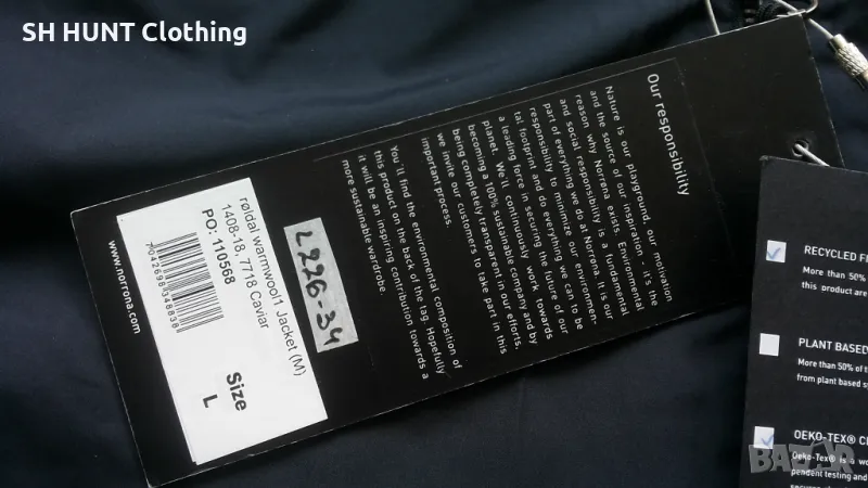 Марка: NORRONA Roldal WarmWool1 Jacket 18% Merino Wool - горница 18% Мерино Вълна L226-34 Размер: L - ширина под мишниците при нормално положение 60 см , разтяга се до 67 см , дължина 87 см заедно с яката , 82 см без яката.
