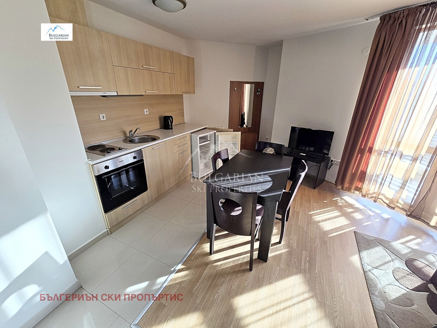 Дневна с кухненски бокс: оборудвана кухня (вградена фурна, керамични котлони,