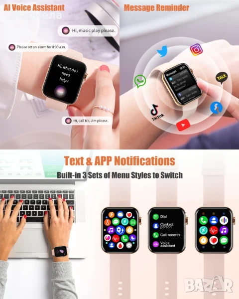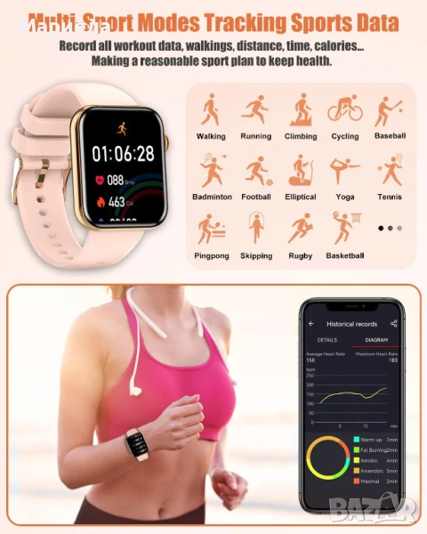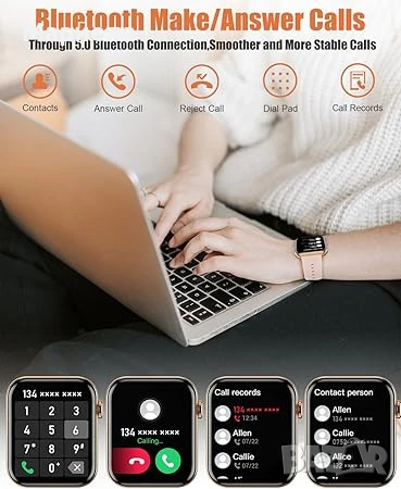 Осъществяване/получаване на повиквания и интелигентни известия: Този часовник ви позволява да осъществявате и получавате повиквания директно от китката си чрез Bluetooth. Той също така поддържа известия и съобщения от социални медийни платформи (Facebook, WhatsApp, Instagram, Twitter и други). Благодарение на предупреждението с вибрация, няма да пропуснете важни обаждания или съобщения, дори по време на разходка или тренировка, когато телефонът ви е оставен в джоба.