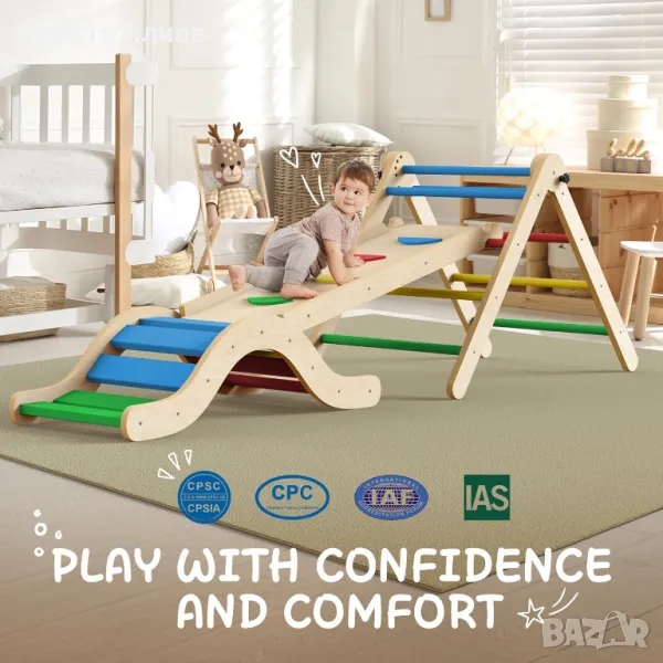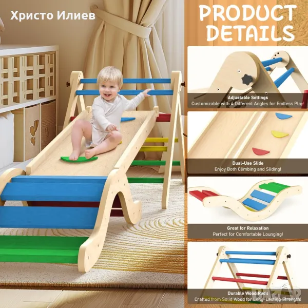 УНИВЕРСАЛЕН КОМПЛЕКТ ЗА ИГРА MONTESORI Този комплект "всичко в едно" включва стълба за катерене, имитация на стена за катерене, пързалка, катерушка с лък и постелка. Той е предназначен да насърчава физическото развитие, баланса, координацията и семейните връзки, което го прави перфектният подарък за малки деца.