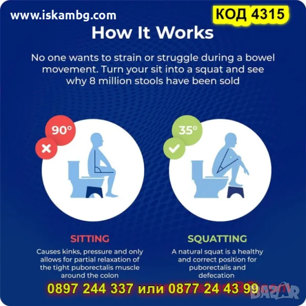 Подобрете ежедневния си комфорт и здраве с помощта на столчето за правилно изхождане. Идеално за всеки, който търси по-здравословен и естествен начин за поддържане на храносмилателната система!