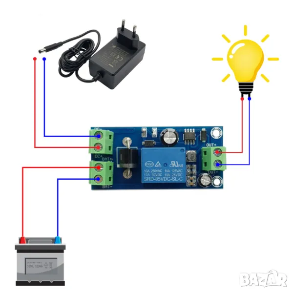 работа. Модула прекъсва захранването на батерията, когато захранването от електрическата