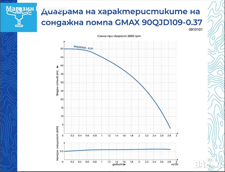Сондажна водна помпа Gmax 2,8m3/ч, макс. дълбоч. 30м. воден стълб 50м.